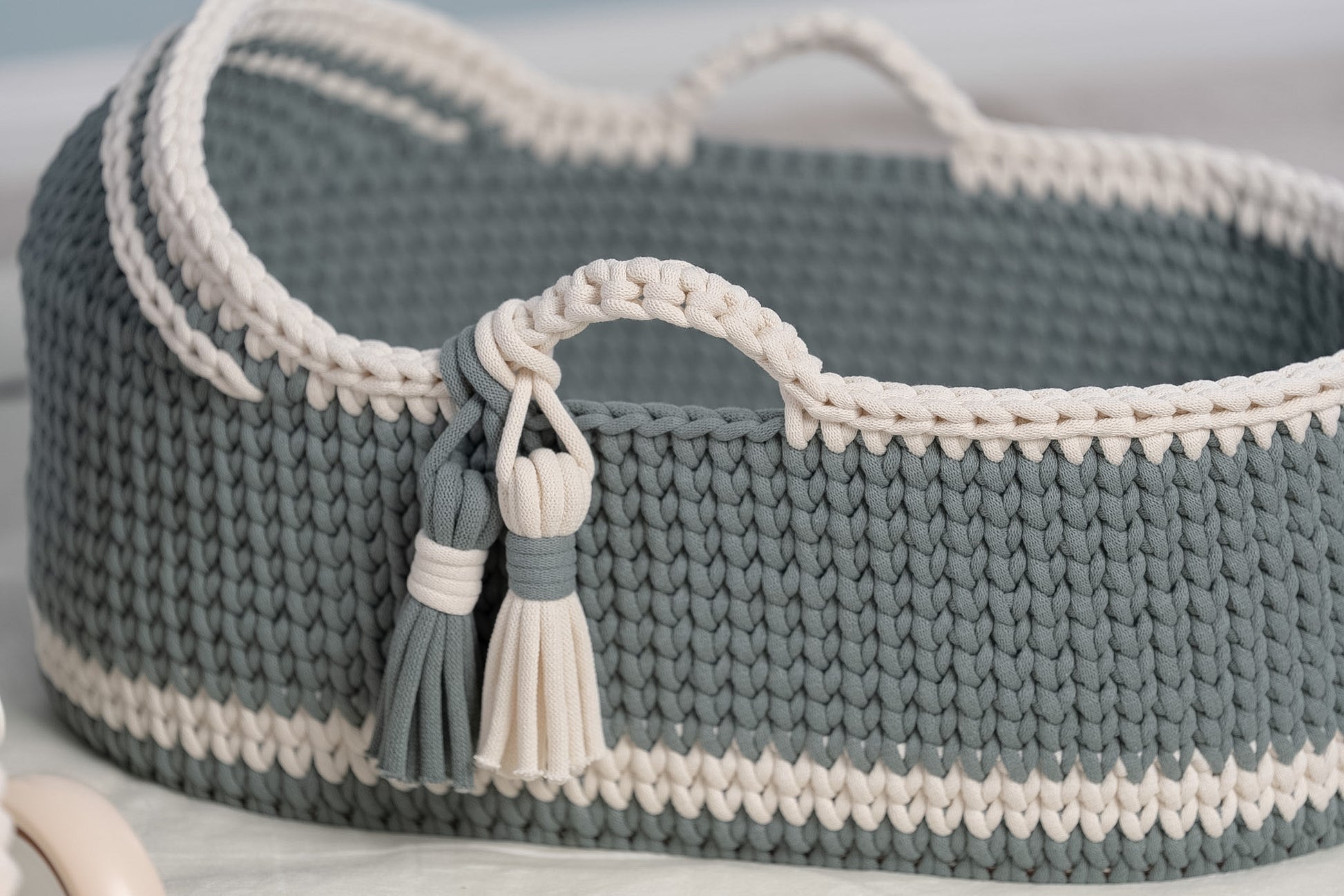 Handcrafted with intention, this baby Moses basket features a sturdy wooden base and is beautifully crocheted using premium 9mm Bobbiny cord made from 100% OEKO-TEX® certified cotton—soft, breathable, and gentle against delicate newborn skin.